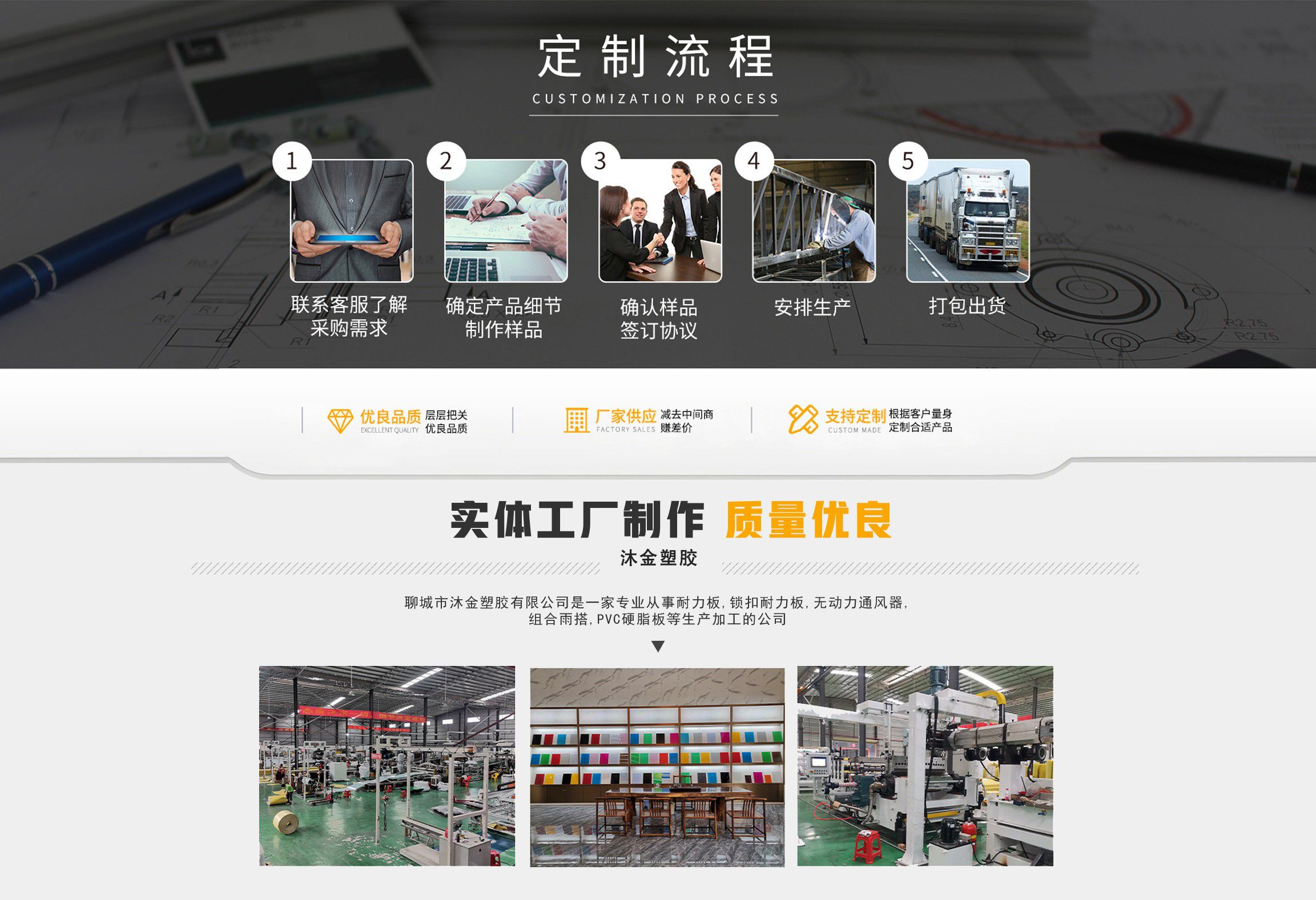 聊城市沐金塑膠有限公司注冊(cè)資金2180萬(wàn)元,占地20000余平方,擁有自建廠房15000平方,員工100余名。10余年來(lái),公司主營(yíng)耐力板,鎖扣耐力板,耐力板深加工,無(wú)動(dòng)力通風(fēng)器,組合雨搭,PVC硬脂板,耐力板廠家等板材的發(fā)展戰(zhàn)略,逐漸成長(zhǎng)為綜合性企業(yè)。 公司擁有多條板材共擠生產(chǎn)線,采用世界知名品牌進(jìn)口原材料和先進(jìn)工藝,依據(jù)完善的ISO9001質(zhì)量管理體系和ISO14001環(huán)境管理體系,為產(chǎn)品的卓越品質(zhì)提供了強(qiáng)有力的保證。憑借過(guò)硬的創(chuàng)新能力和堅(jiān)實(shí)的硬件基礎(chǔ),贏創(chuàng)已成為國(guó)內(nèi)領(lǐng)先的熱塑性板材生產(chǎn)商,產(chǎn)品被廣泛應(yīng)用于建筑業(yè)、農(nóng)業(yè)、工業(yè)、廣告業(yè)、安防行業(yè)及DIY領(lǐng)域。 公司始終致力于通過(guò)提供最優(yōu)的板材應(yīng)用解決方案,為客戶(hù)創(chuàng)造最高的價(jià)值;堅(jiān)守創(chuàng)新、質(zhì)量、靈活、服務(wù)和速度的核心價(jià)值觀;堅(jiān)持“完美的產(chǎn)品需要完美服務(wù)的支持”的經(jīng)營(yíng)理念,努力實(shí)現(xiàn)成為世界領(lǐng)先的板材與解決方案供應(yīng)商的夢(mèng)想。 在未來(lái),公司將立足客戶(hù)需求,不斷改變和完善現(xiàn)有產(chǎn)品,拓展產(chǎn)品線和充分開(kāi)發(fā)板材的應(yīng)用領(lǐng)域,為客戶(hù)創(chuàng)造全方位的價(jià)值。同時(shí)更好地實(shí)現(xiàn)員工的價(jià)值,實(shí)現(xiàn)公司團(tuán)隊(duì)的價(jià)值。我們將與您一起創(chuàng)贏未來(lái)! 企業(yè)使命:成為世界領(lǐng)先的板材與解決方案供應(yīng)商。 公司愿景:通過(guò)提供最優(yōu)的板材應(yīng)用解決方案,為客戶(hù)創(chuàng)造最高的價(jià)值。 核心價(jià)值觀:質(zhì)量...